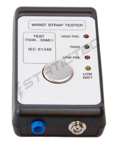 Portable instrument for checking wrist strap and cord. Unit has 4mm banana socket and 10mm stud connections. Portable kit inlcuding tester abd 9V battery.